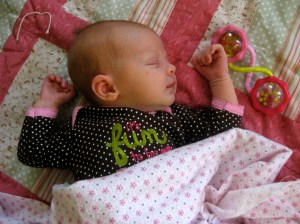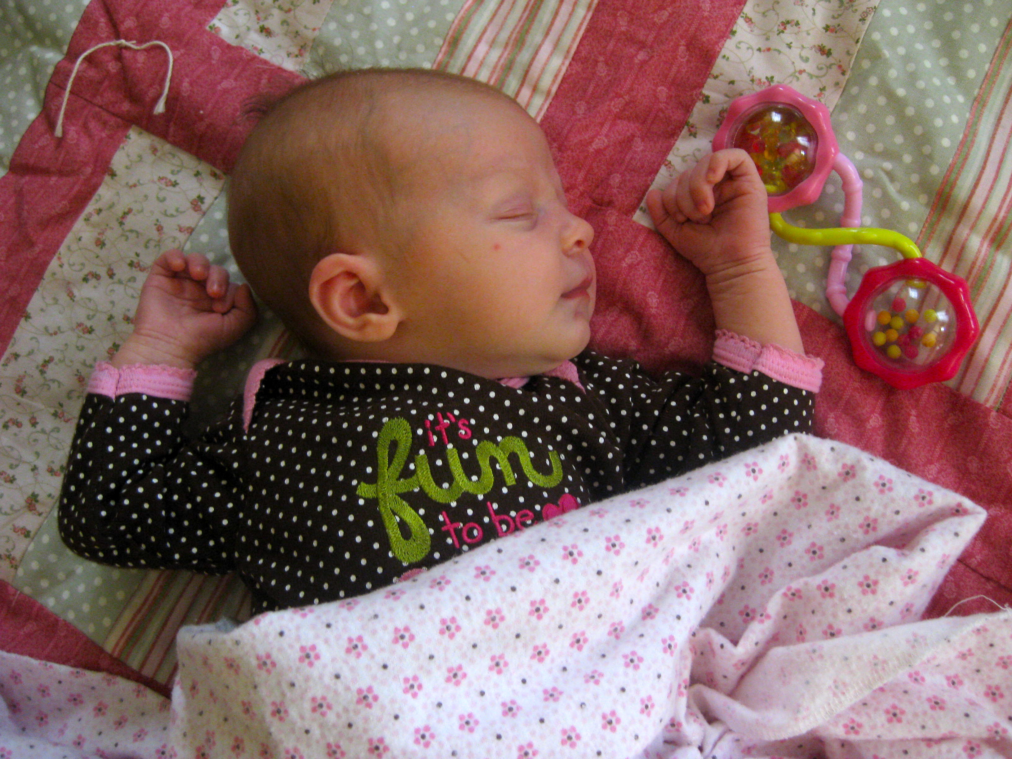 I could seriously write a book on each of these topics. I am full to the brim of STUFF that this girl has done to me. And I will probably blog about a lot of it later. But right now, I am watching her lay sprawled out on a blanket on the floor, her sweet cheeks flushed pink, her arms stretched out, her rattle and pacifier laying close by, tucked under her blanket. It’s taking self-control not to scoop her up (therein WAKING her up) and just hold her close. I can’t believe she went from being that little peanut ultrasound to being a nine-pound, four ounce baby girl, getting bigger by the day. I can’t believe I went from being so unsure I could do this mom thing that first week to suddenly being unsure I really wanted her to grow up.