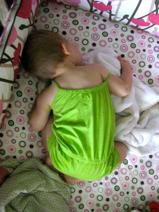 I relented, and started to pack an overnight bag. I literally teared up three times. I envisioned her screaming from her pack ‘n play, wondering why mom wasn’t coming to get her, feeling alone and abandoned. I pictured her and my dad, both exhausted, sleeping on the couch with the tv on low, Heidi tucked into the crevice of his arm having finally dozed off. I pictured mom and dad the next morning, frazzled and eyes red-rimmed, lips to coffee cups, glad ย they only had Heidi for one night.