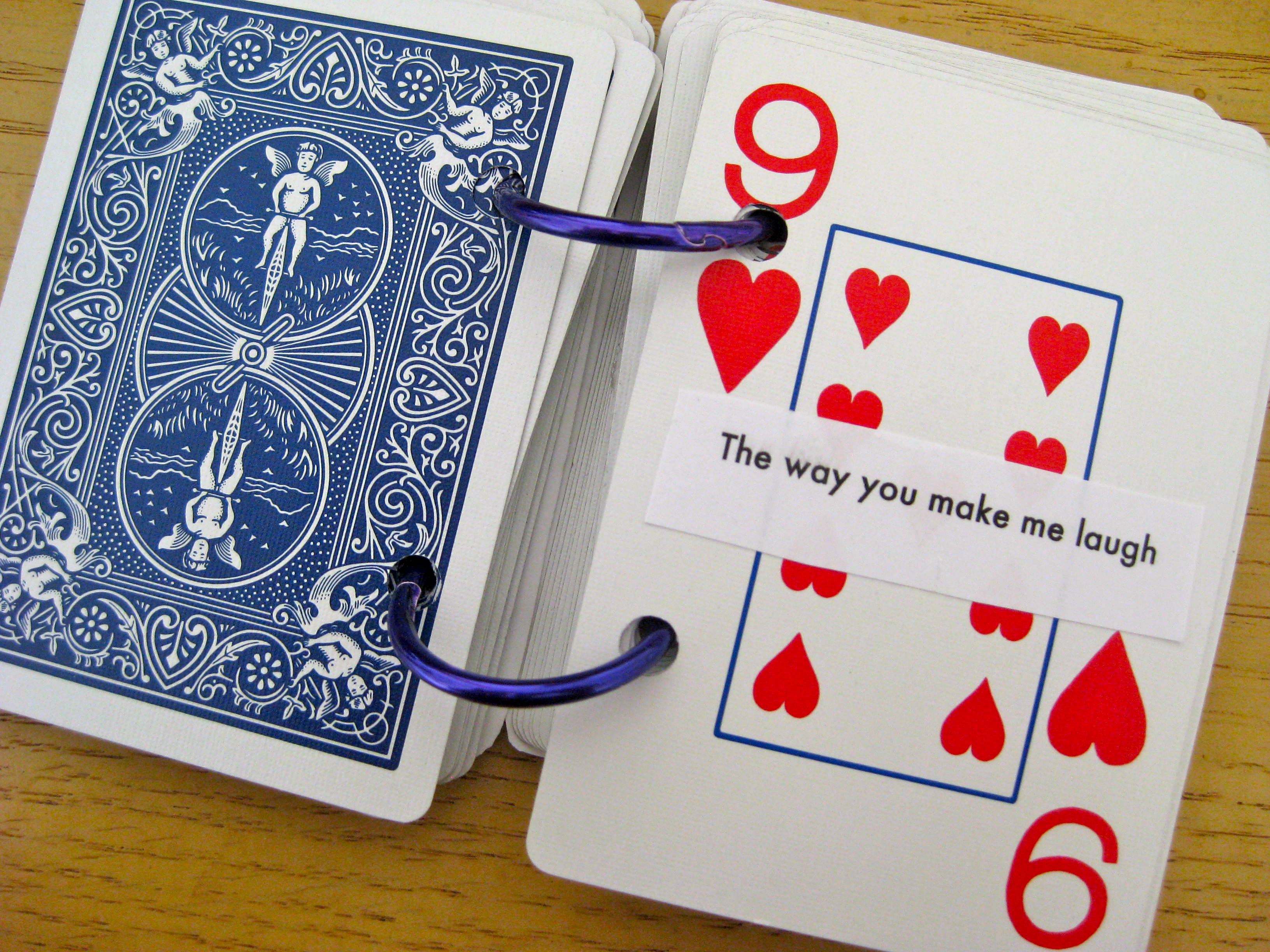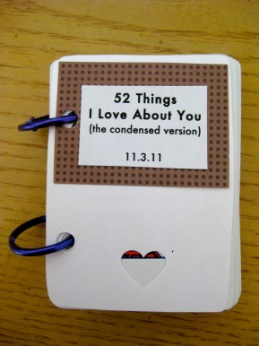 I found a deck of cards we weren’t using (being married to a magician means we have about twenty old decks of cards laying around the house), and I decided to write one thing I loved about him on each and every card. This didn’t seem tough to do until I sat down to make my list. I’ll be 100% honest…coming up with 52 things took me a few days. It wasn’t because there weren’t 52 things about him I loved. It was because my heart had become to callous and so focused on the negative that I forgot how to see the good in him. Once I was on a roll, however, it became easy.  I typed up the list, cut each one out, and stuck it to a card. I hole-punched the sides and inserted metal rings.