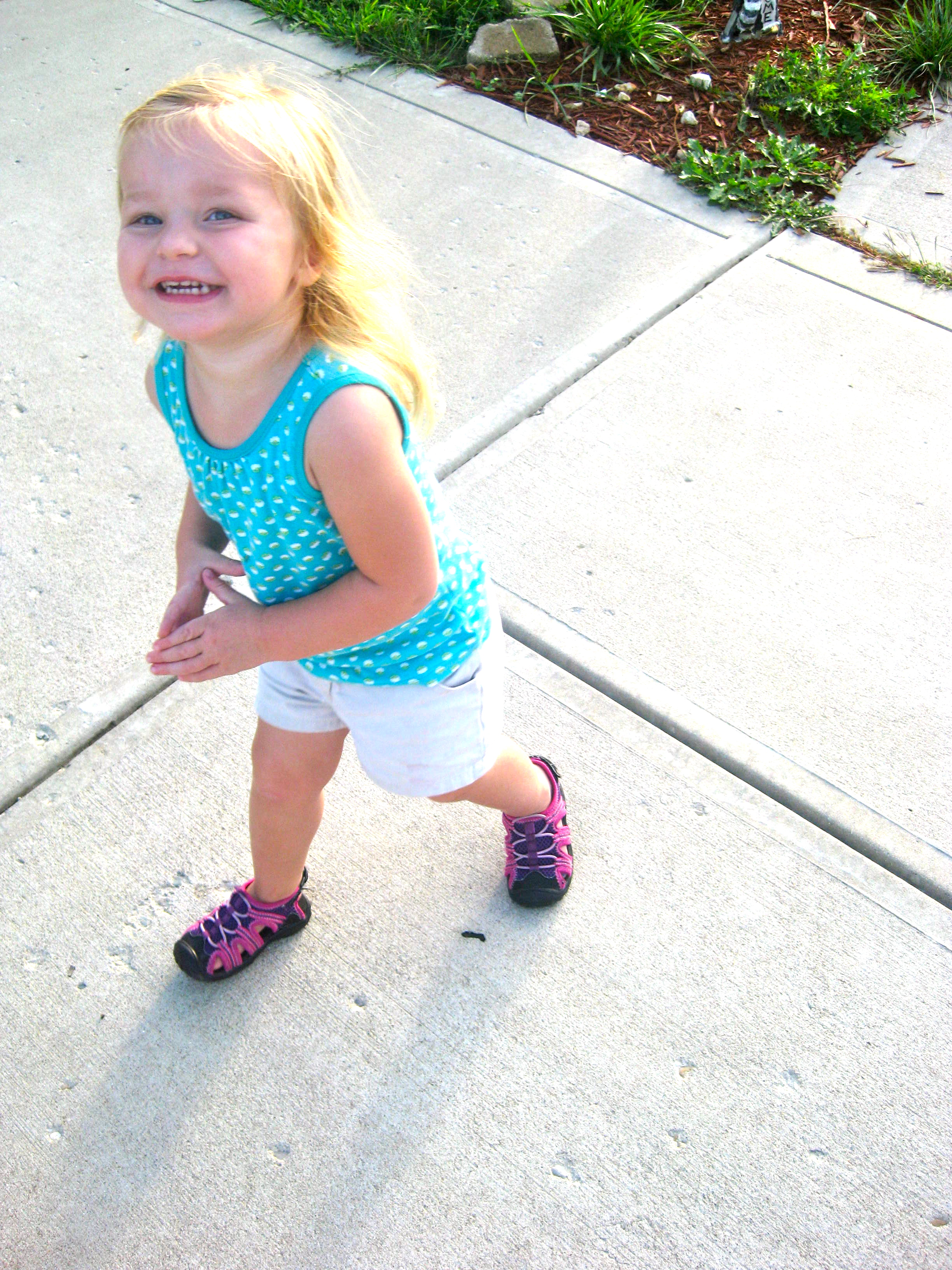 Her sweet face erupts in a flash of anger, and she whirls around to face me, her blonde hair flying. Her eyes are narrow, her cheeks are flushed red, and her mouth is set. She flings an arm in my direction as a warning. I’ll hit you, she says with her eyes. I’m mad at you and I don’t have to do what you say and I will hit you. Her blue eyes are icy with stubbornness and no longer reflect the squinty smile she typically wears.