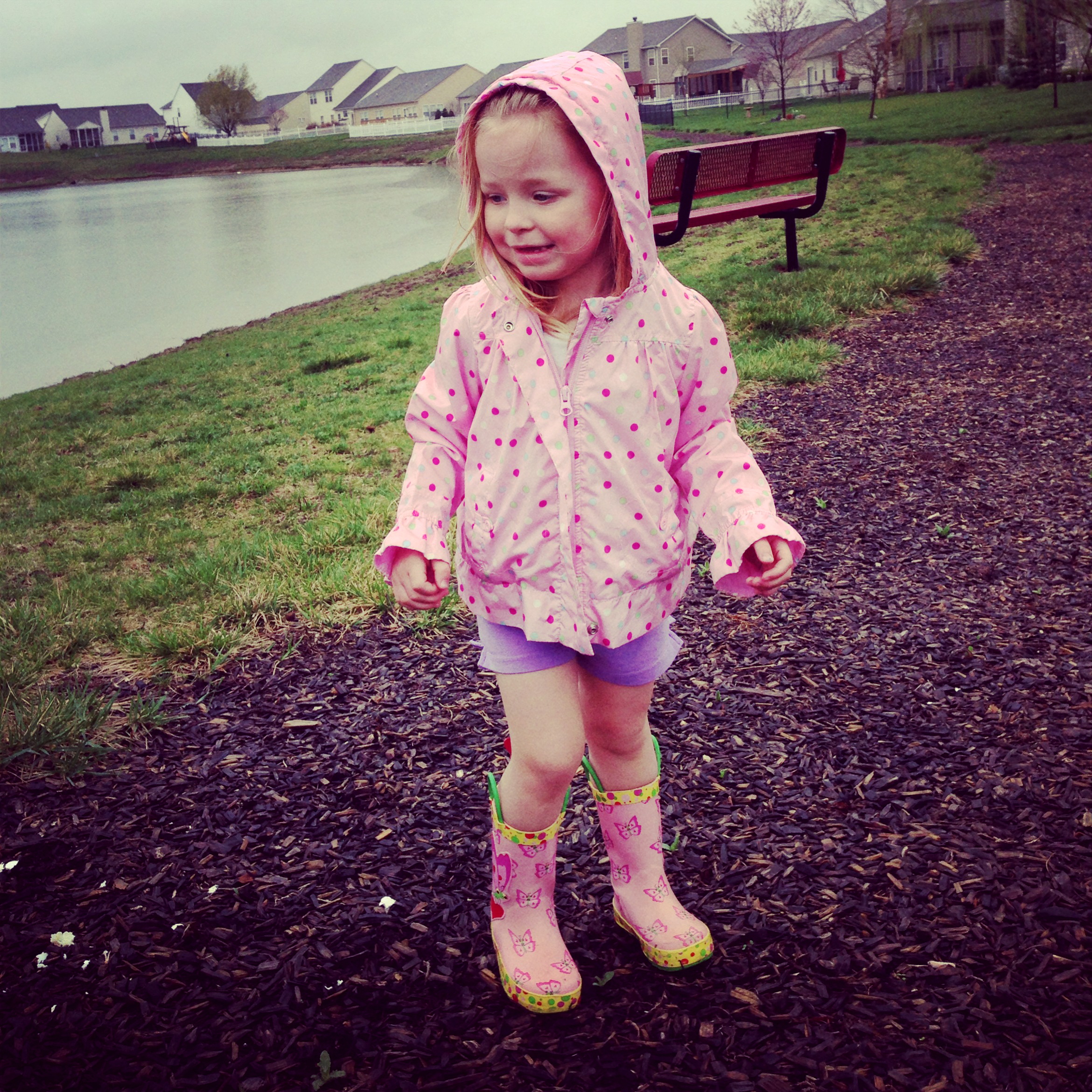 In both cases, I followed her…far enough to give her space but close enough to intervene if she needed me…I couldn’t help but envy her fearlessness, her lack of knowledge for what time of day it was or what still had to be done, her pure enjoyment of the moment, regardless of the weather. She was following her own path, and she wasn’t worried what was up ahead: in fact, she welcomed it. She didn’t worry about getting soaking wet. She didn’t pay attention to anything but what needed to be tasted and experienced right in front of her. She didn’t worry about falling and skinning her knee until it actually happened. When it did, she would immediately turn my way (after twenty minutes of not even noticing me), tears streaking her face, and reach for me, expecting me to be right there.