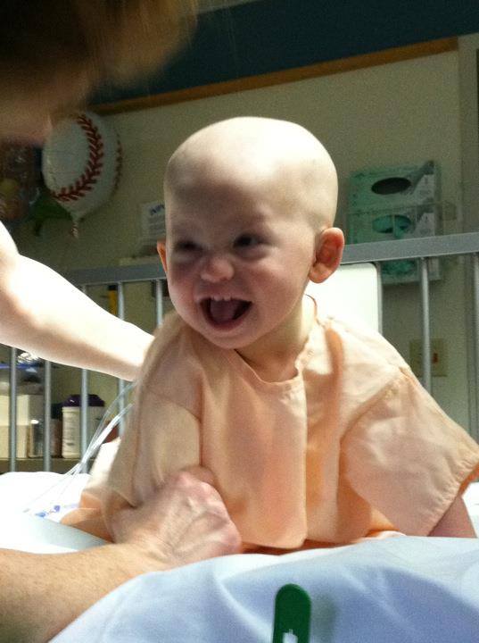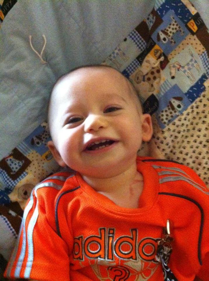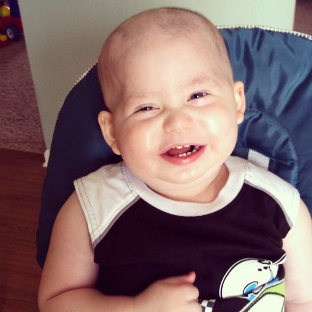 Sweet Xander smiling during his first few weeks of treatments, sitting on a prayer blanket made for him by a friend.