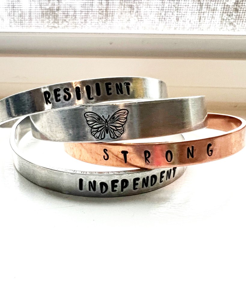 So we’re just going to start. We are currently stamping metal bar and washer bracelets, and we do offer custom work! We have a few ideas for products up the road. But know this: ten percent of our proceeds get donated to Allies monthly, and we are constantly working to communicate our end goal: to provide job training to trafficking survivors.